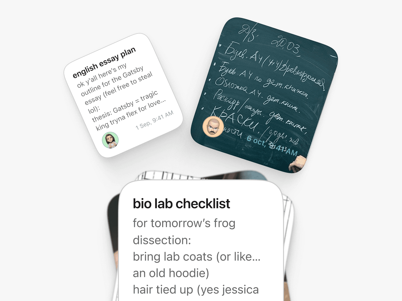 Расписание: студент кастомизирует предметы — иконки, цвета, аббревиатуры. Система periods привычна американским студентам. Все изменения мгновенно синхронизируются с группой. Заметки: поддержка форматирования, рассчитаны на большие тексты. Система стопок для организации конспектов. Без чатов — обновления через расписание и заметки. Группы: присоединение по ссылке, синхронизация в реальном времени. Никаких чатов — только структурированные данные. Студент видит обновления, а не сообщения.